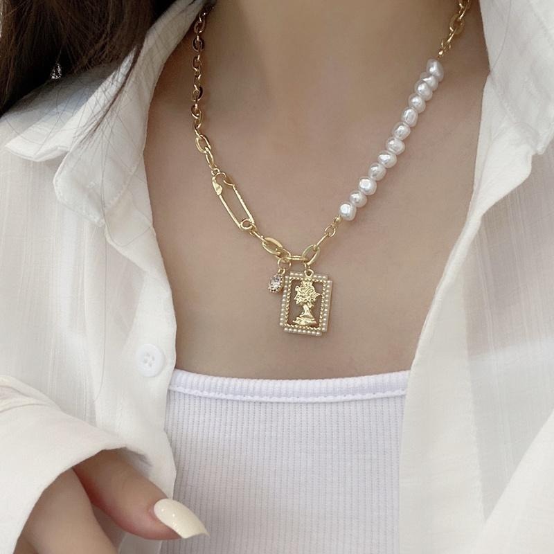 台灣現貨⚇項鍊⚇復古珍珠拼接方牌人像項鍊小眾設計感ins冷淡風別針鎖骨鏈 Justlikepig就愛豬飾品🐷