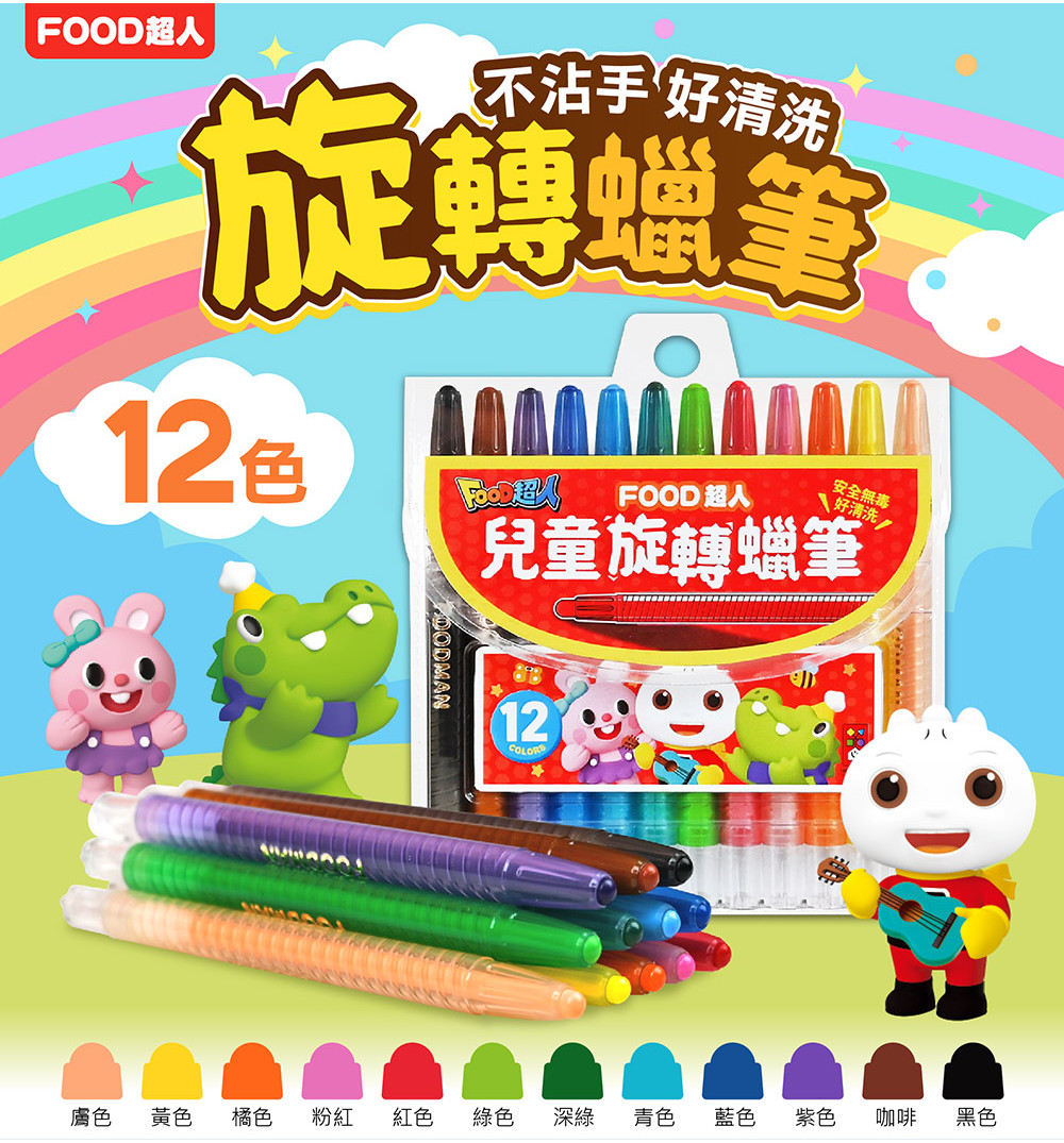 FOOD超人兒童旋轉蠟筆選用12色鮮明色彩,刺激孩子視覺發展。專為小手掌設計的筆桿長度,使孩子塗鴉時不因筆身過長而重心偏移,更好控制手指肌肉與小肌肉的精細動作,提高手指與大腦間的協調與穩定。