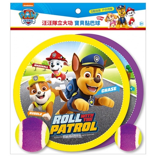 兩個汪汪隊圖案的魔鬼氈圓盤和兩顆大小不同的絨毛球。