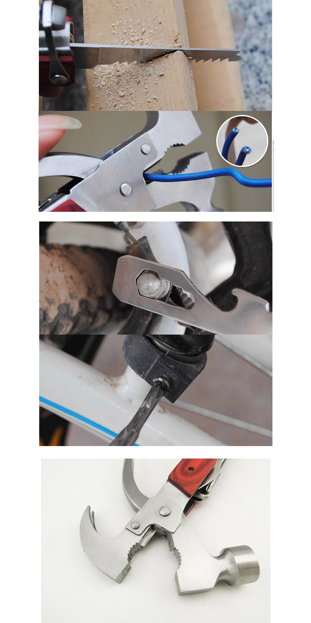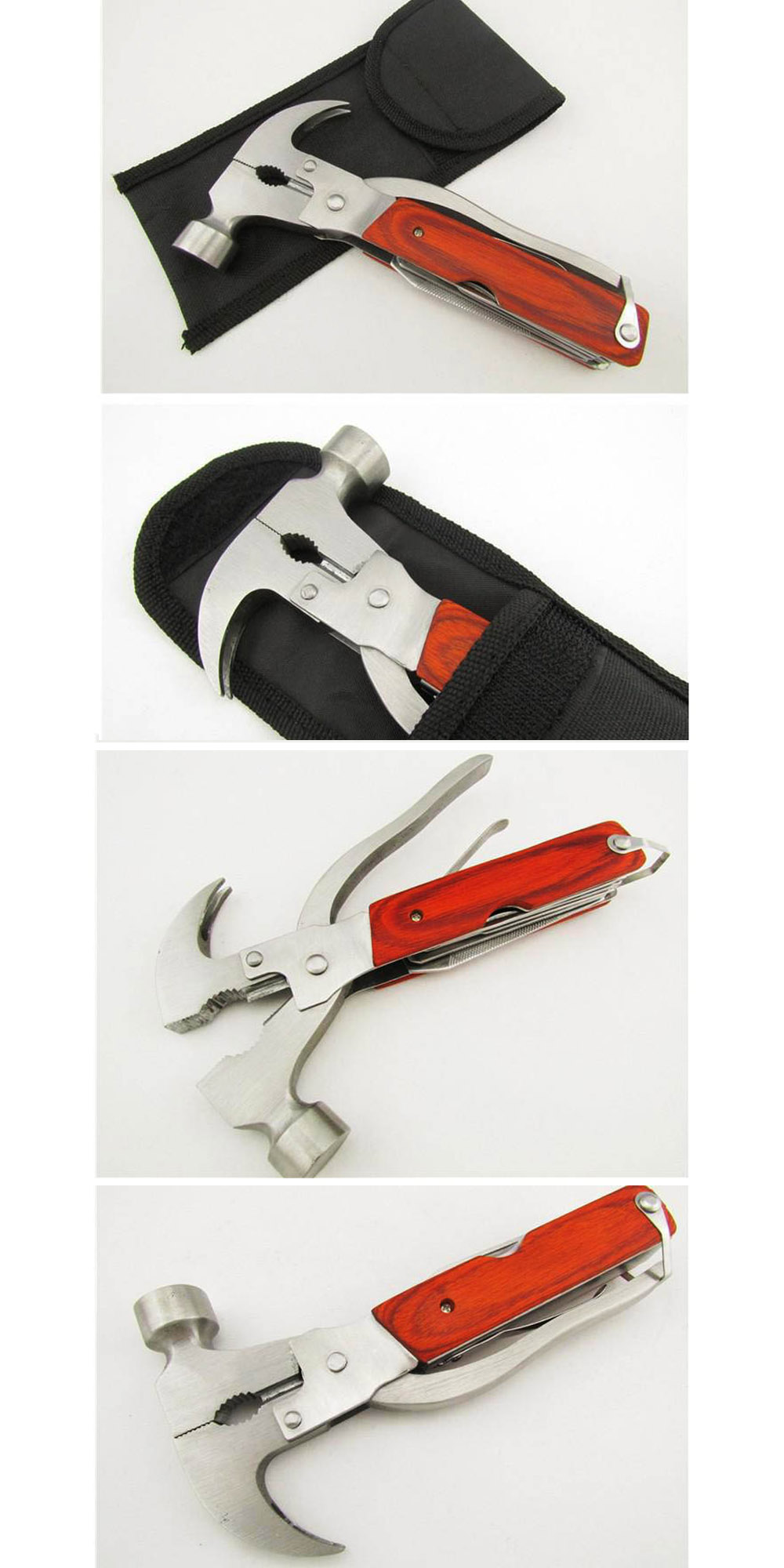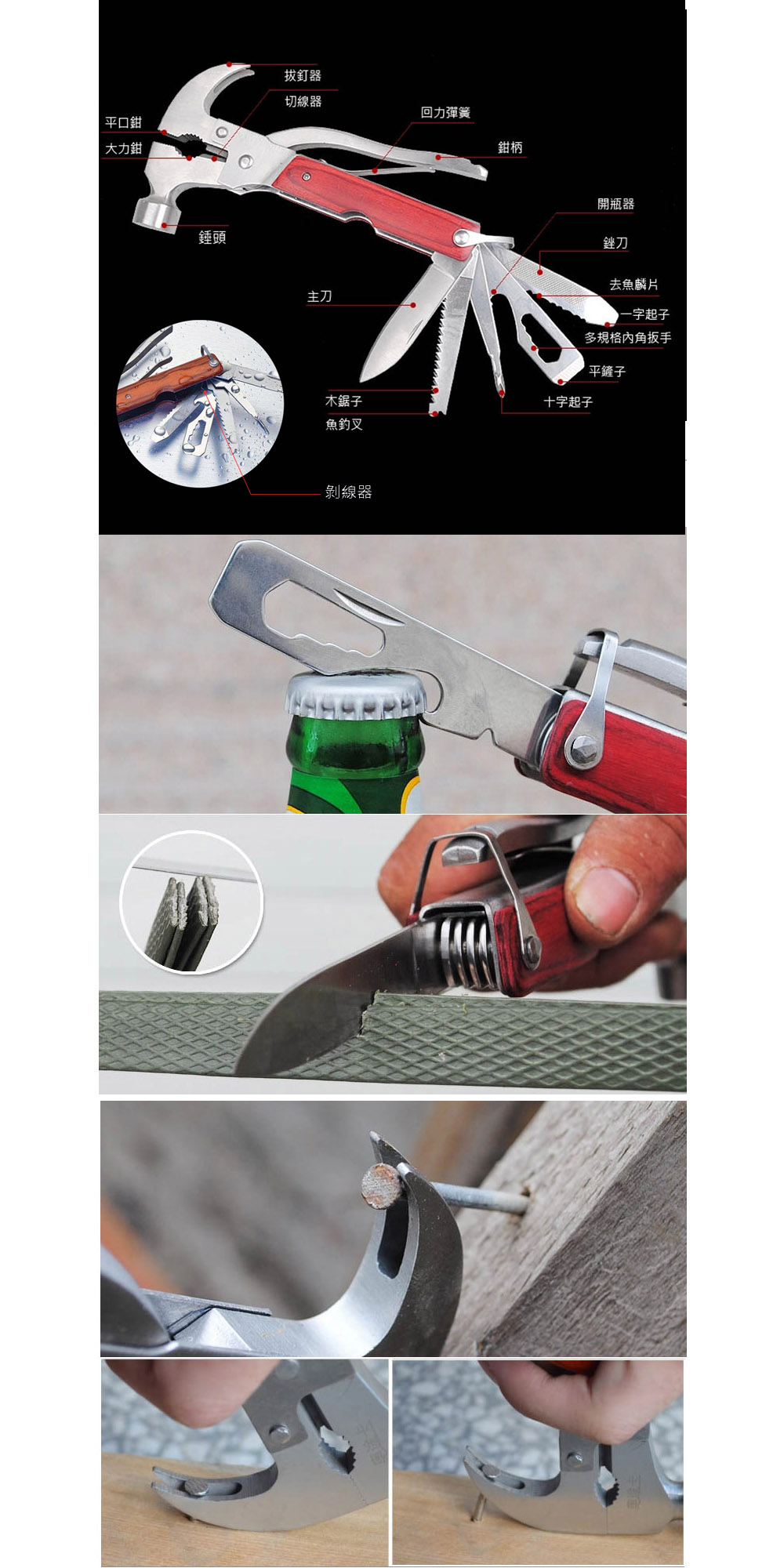 功能說明:16種功能合一(含切線器、拔釘器、斧頭、大力鉗、平口鉗、錘頭、銼刀、去魚鱗刀、一字起子、十字起子、開瓶器、多規格內角扳手、木鋸子、魚鉤叉、剝線器、主刀)
