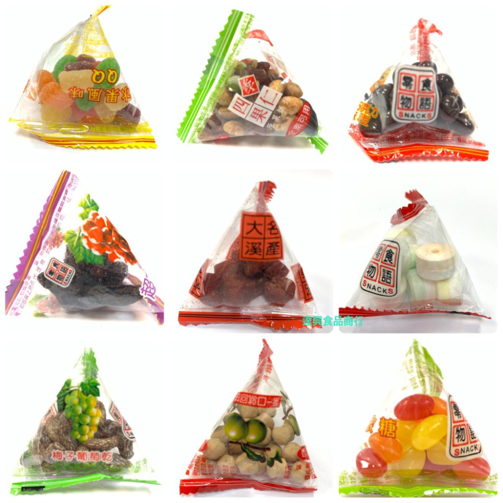仙楂丸/朱果巧克力/四季果仁/雷根糖/水果QQ軟糖/葡萄軟糖/梅子葡萄乾/特大葡萄乾/逼逼糖/芒果軟糖/溢旺三角豆丁