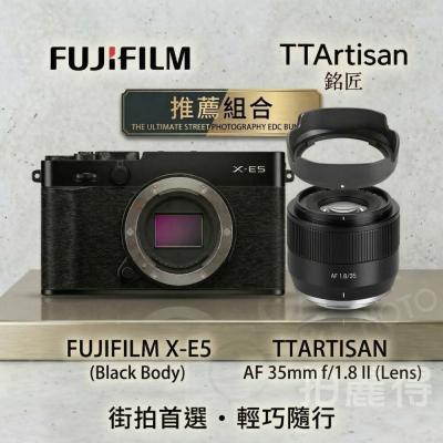 最接近人眼直覺的經典視角!當極簡美學的 Fujifilm X-E5 黑色機身 遇上全面進化的 TTArtisan 銘匠 AF 35mm F1.8 II (二代) 自動對焦鏡頭,便構成了最強的隨身攝影組合。35mm 焦段提供等效約 52.5mm 的標準視角,成像自然且無畸變,非常適合人像、美食與街頭紀錄。二代鏡頭不僅體積更輕巧,自動對焦速度也大幅提升。本組合機身享有原廠兩年保固,是您每日隨行 (EDC) 最值得信賴的影像夥伴!