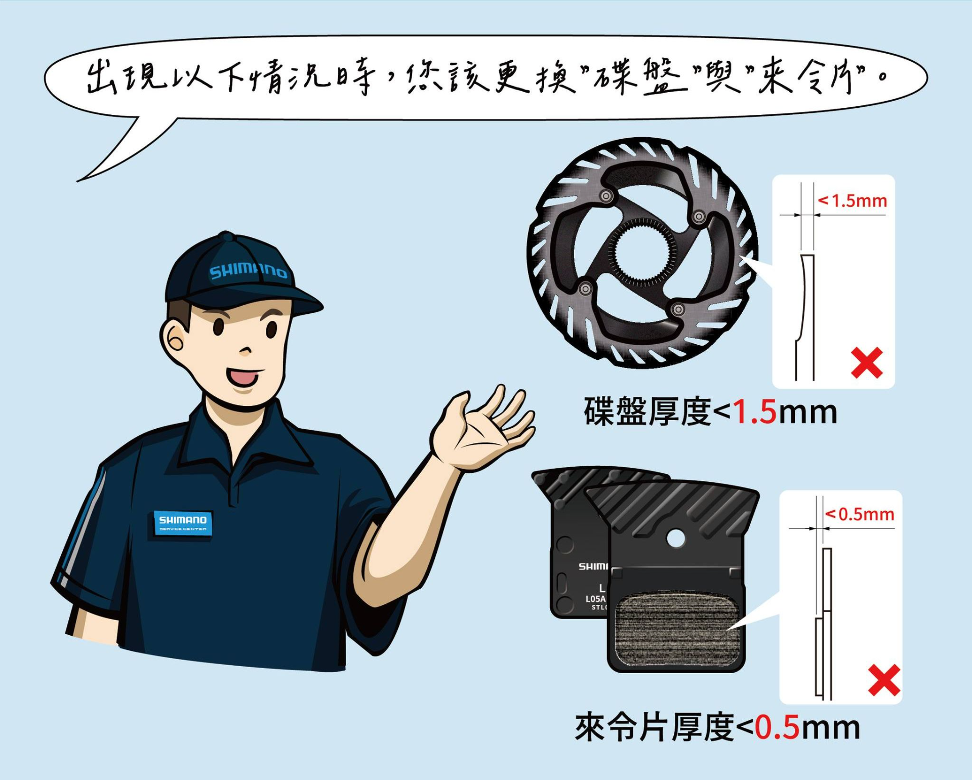 全新的來令片總厚度4mm(背板厚度1.7mm,煞車皮厚度2.3mm),與shimano原廠一樣,煞車皮厚度低於0.5mm(總厚度低於2.1mm)就需更換,下面有圖片教學請務必看一下。