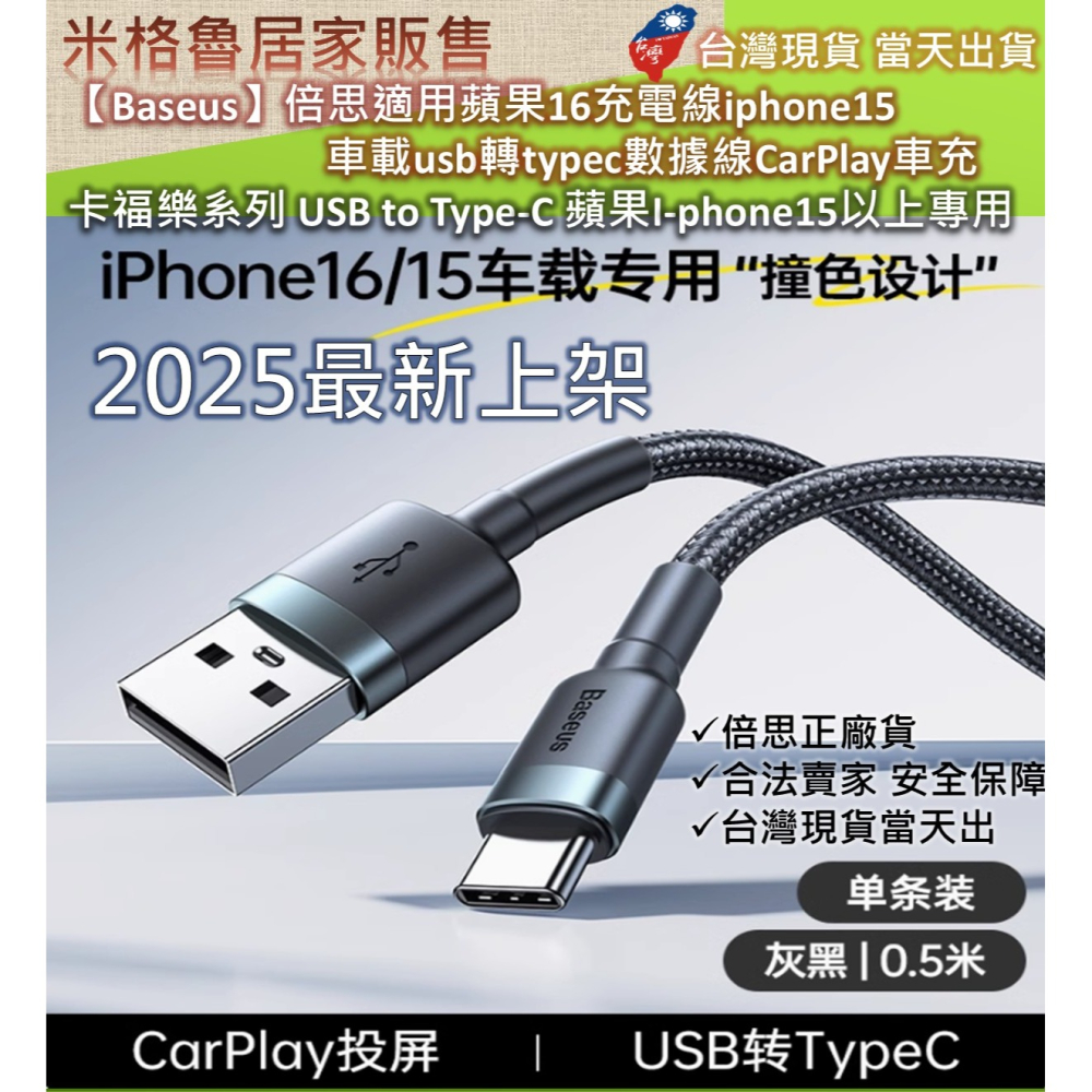 【Baseus】 倍思卡福樂USB 轉Type-C數據線Car Play車載投屏充電適配蘋果15/16華為小米紅米3A安卓Type-C手機線快充QC3.0充電線