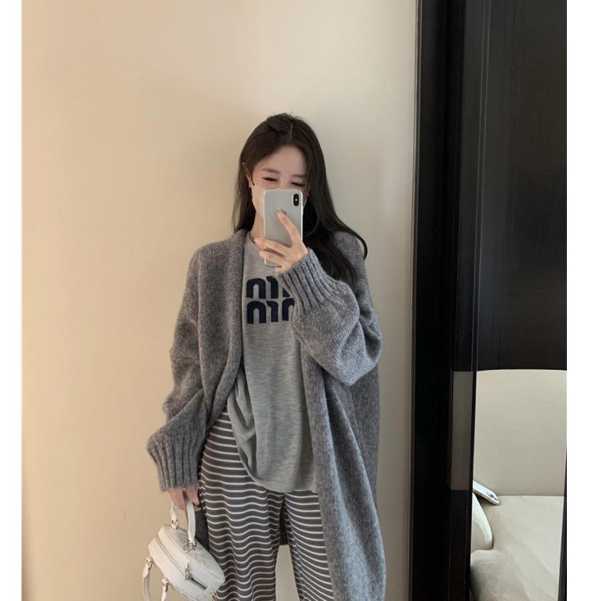 慵懶風灰色毛衣外套☻秋季針織中長款寬鬆外套