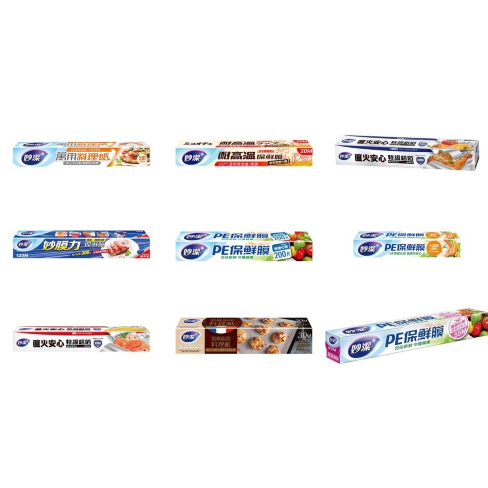 產品規格及說明都不一樣,下單前請詳閱,謝謝~~~~ 【妙潔 耐高溫保鮮膜】 .微波爐 / 燉鍋專用 .可耐熱至 160℃,高溫烹調不易破 .採用最先進 PMP 材質 .安全無毒,不含氯、不含塑化劑 .好撕不糾結,黏性佳 規格:30cm X 20M 材質名稱:PMP聚甲基戊烯(Polymethylpentene) 原產地:日本 耐冷熱溫度:-20℃~160℃ 有效期間:五年 注意事項: 1.本產品請勿放置於火爐邊,以免過熱造成保鮮膜收縮。 2.於微波爐使用時宜在封口處預留間隙或以牙籤刺出三-五小孔,可以避免膨脹破裂,以達透氣效果 【妙潔 PE保鮮膜 200尺】 .不含氯,不含塑化劑,安全無毒 規格:30cm X 200尺 材質名稱:低密度聚乙烯(LDPE) 原產地:臺灣 耐冷熱溫度:-20℃~95℃ 有效期間:五年 注意事項: 1.本產品請勿放置於烤箱上方或爐火邊,以免遇熱造成PE膜收縮。 2.請勿與高油性食品直接接觸,另於加熱使用時,宜在封口處預留間隙或以牙籤刺出三~五小孔,可避免膨脹破裂,以達透氣效果。 【妙潔 PE保鮮膜22cm x 30M】(小碗盤專用) .適用小碗盤 包覆剛剛好 .不含氯,不含塑化劑,安全無毒 規格:22cm X 30M 材質名稱:低密度聚乙烯(LDPE) 原產地:臺灣 耐冷熱溫度:-20℃~95℃ 有效期間:五年 注意事項: 1.本產品請勿放置於烤箱上方或爐火邊,以免遇熱造成PE膜收縮。 2.請勿與高油性食品直接接觸,另於加熱使用時,宜在封口處預留間隙或以牙籤刺出三~五小孔,可避免膨脹破裂,以達透氣效果。 【妙潔 PE保鮮膜 30cm×55M】 .無塑化劑 健康好安心 .使用PE原料 不含氯 .安全無毒健康有保障 規格:30cm X 55M 材質名稱:聚乙烯(Polyethylene) 原產地:臺灣 耐冷熱溫度:-20℃~95℃ 有效期間:五年 注意事項: 1.本產品請勿放置於烤箱上方或爐火邊,以免遇熱造成PE膜收縮。 【妙潔 妙膜力保鮮膜120M】 .創新膜體技術,高達 300% 延展力 .包覆食材器皿,隨形貼合更緊密 .無氯無塑化劑,接觸食物更安心 .隨手滑好幫手,親子廚房更放心 規格:30cm X 120M(附安全滑刀) 材質名稱:線性低密度聚乙烯(LLDPE) 原產地:中國 耐冷熱溫度:-30℃~100℃ 有效期間:五年 保存方法:請置於陰涼處,勿置於烤箱上方或爐火邊,以免遇熱造成保鮮膜收縮 注意事項: 1.本產品密封性極佳,加熱前需刺3~5個小孔或在封口處預留間隙透氣,避免膨脹破裂。 2.使用微波爐時,請將食物放入較深的容器內,勿直接接觸高油性食物及長時間加熱。 【妙潔 萬用料理紙22cm x 7M】(小烤箱專用) .小烤箱適用 .採用中央鋸片裁刀,方便俐落好撕取 .紙材兩面均可使用,可重覆多次使用 .安心不沾黏,輕鬆好料理 規格/入數:22cm X 7M 材質名稱:純紙漿、矽膠 原產地:法國 耐熱溫度:220℃ 有效期間:5年 注意事項: 1.請勿直接接觸電熱管或直接在火上使用。 2.請依烤箱、氣炸鍋、微波爐或其他烹飪器具的使用說明使用,若料理紙超出容器尺寸或食物太多,容易造成紙張空燒。 3.本品高溫受熱後變色,屬正常現象,不影響食品安全。 4.本品不添加螢光劑,紙張顏色差異為正常現象,不影響使用功能。 【妙潔 頂極廚房料理紙30M】 .特選通過歐洲權威認證之法國進口紙源 .米其林三星廚房的專業用紙 .無塑化劑、無螢光增白劑、無雙酚A .不沾黏、烘焙好脫模 .不易破、強韌不易破紙 .不易油滲、烤盤器具好清洗 .蒸炊、烘烤、鍋煎、微波、油炸、氣炸皆可適用 規格/入數:30cm X 30M 材質名稱:純紙漿、矽膠 原產地:法國 耐熱溫度:220℃ 有效期間:5年 保存方法:置於陰涼處,並遠離火源 注意事項: 1.請勿直接接觸電熱管或直接在火上使用。 2.請依烤箱、氣炸鍋、微波爐或其他烹飪器具的使用說明使用,若料理紙超出容器尺寸或食物太多,容易造成紙張空燒。 3.本品高溫受熱後變色,屬正常現象,不影響食品安全。 4.本品不添加螢光劑,紙張顏色差異為正常現象,不影響使用功能。 【直火安心特級鋁箔】 .高規格全新鋁材 . 通過歐盟無毒安全檢測 . 導熱快、不易沾黏、防油汙、好撕取 . 炙燒烘烤各式頂極料理之安心首選 材質:鋁箔 規格:30cm X 8M,30cm×120吋 原產地:台灣 保存期限:3年
