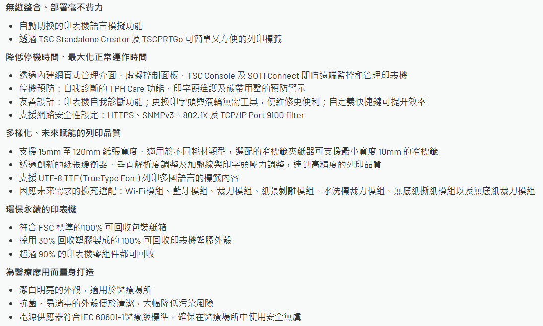TH 系列具備印表機語言模擬功能,隨插即用。其韌體可自動辨識主流印表機品牌的語言,無須重製標籤版面就能立刻開始列印。TH 系列透過多樣化的印表機管理工具 (內建網頁式管理介面、虛擬控制面板、TSC Console 及 SOTI Connect)、印表機停機預防警示及支援網路安全性設定,減少日常運作時的停機時間,得以高效管理印表機。