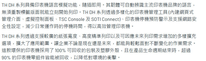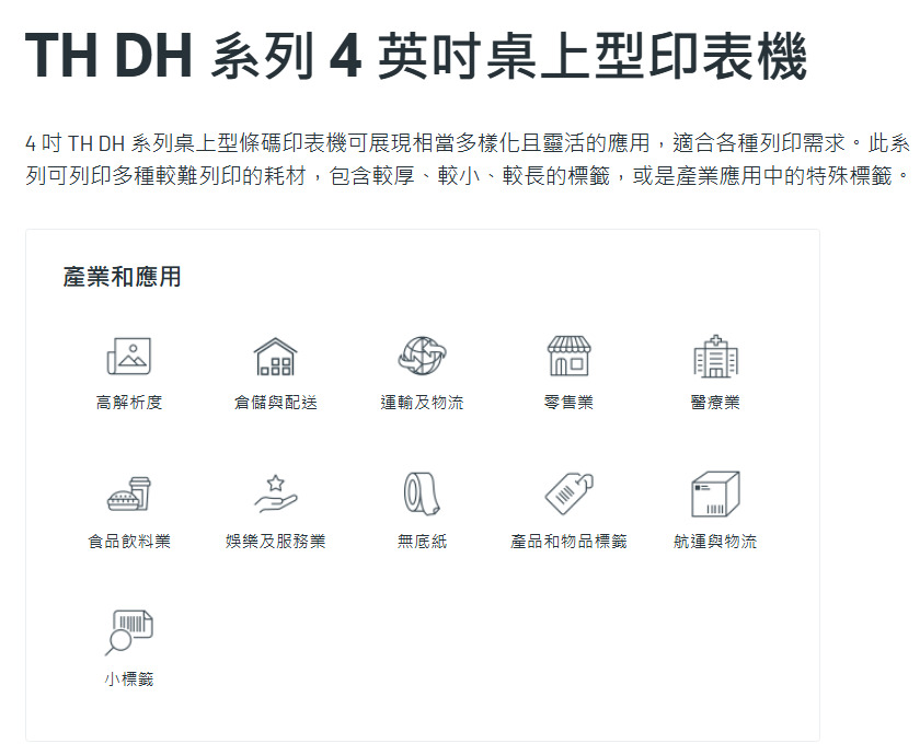 4 吋 TH 系列桌上型條碼印表機可展現相當多樣化且靈活的應用,適合各種列印需求。此系列可列印多種較難列印的耗材,包含較厚、較小、較長的標籤,或是產業應用中的特殊標籤。