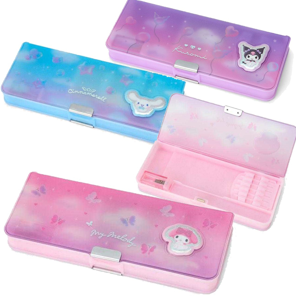 雙面/雙開使用,磁吸式開關,附時間表/姓名標籤,六支置筆處/三角板收納,可以橫放在書包,側邊有小削筆器