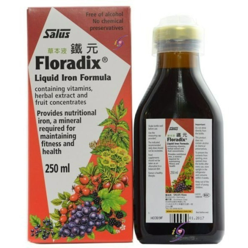 鐵元Floradix主要含有易於人體吸收的植物二價鐵、豐富的維他命B群,以及助鐵吸收的維他命C。獨特液體配方,吸收效果佳。