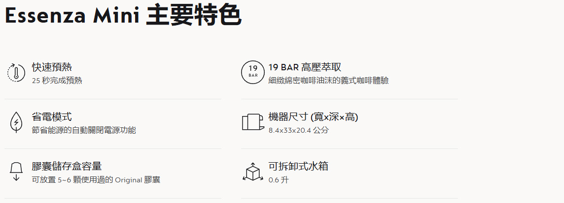 ★19Bar高壓, 25秒預熱,60秒內萃出頂級咖啡,九分鐘自動關機