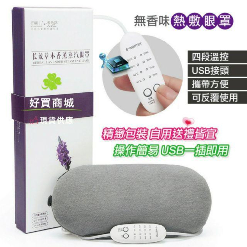 ★舒緩眼部:上班族、居家追劇,舒緩疲勞雙眼必備好物 ★重覆使用:可拆洗重複使用,省荷包更環保 ★使用安心:三段定時、四段溫控,恆溫安全不燙傷 ★告別失眠:含草本薰衣草顆粒,熱熱敷更助眠 (薰衣草香包可拆) 商品規格 產品名稱:四段溫控 蒸氣熱敷眼罩 產品顏色:灰色/紫色 產品尺寸:195 x 105mm 產品材質:外罩、內裡100%棉、薰衣草乾花蕾顆粒、碳纖維發熱組 加熱溫度:可四段溫控 (40度、45度、50度、55度) 使用時間:可三段定時 (15分/30分/60分),建議使用溫度如超過50度,連續使用不要超過30分 供電模式:USB nn n n. N n n. Ann. 電壓/功率:5V/3.5W 內容物:眼罩x1、USB充電線x1、說明書x1  ❣️❣️好買商城❣️ 我們是專業團購批發❣️ 🔥現貨供應,台灣出貨 全館滿799元7-11,全家, 賣家宅配運費只要30元 歡迎公司行號大量採購團購批發 親愛的您在這,能買到的是品質是信任 我們不以低價廉價劣質品搶生意, 一分錢一分貨,魔鬼藏在細節裡 一步一腳印,只提供您CP值高的服務。
