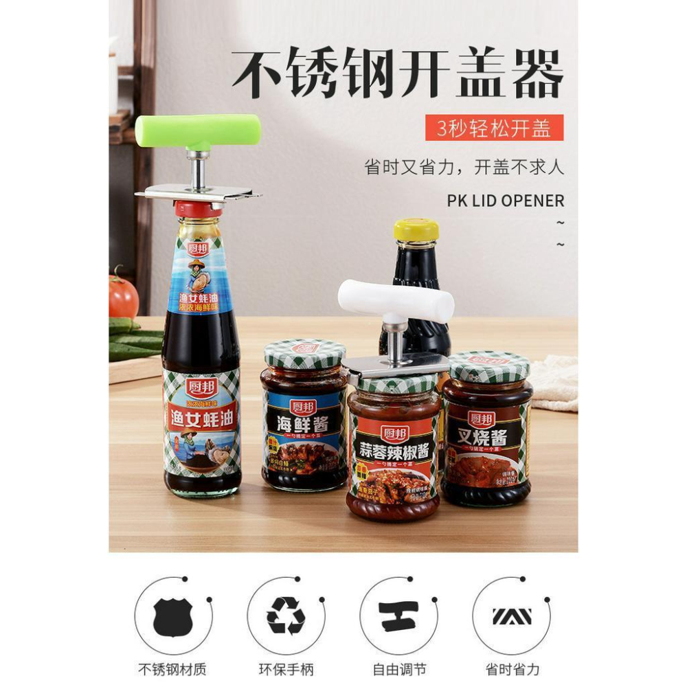 有了這個開蓋器,家裡小瓶大瓶都輕鬆開啟 產品名稱:不銹鋼開蓋器 產品材質:不銹鋼+PP 產品特點:省力輕鬆開蓋 產品規格:8.5*6cm 產品尺寸:洋見圖片 產品適用:多種瓶蓋適用(3CM-9.5CM間距可調)