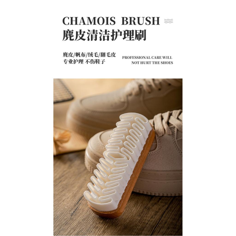 各種毛皮鞋款以及 絨布衣物皆可用 仿生波浪紋理 仿波浪形紋理,增強 摩擦力與清潔力。 品名:絨布鞋擦 重量:83G 材質:實木/生膠 適用: 麂皮、絨面、磨砂、翻毛皮等材質