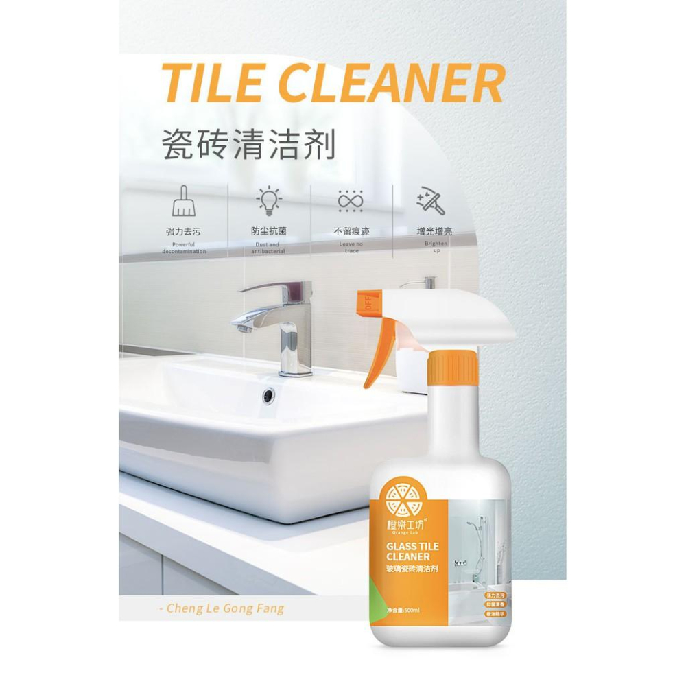 品牌:橙樂工坊 品名:瓷磚清潔劑 產品功能:清潔瓷磚,浴室,不銹鋼器具 規格/有效期:500ml / 3年 儲存方式:使用後石膏密封,放置於陰涼乾燥處 適用範圍: 用於衛生間內:水龍頭,花酒,洗手池 浴盆,淋浴房玻璃門,浴簾,塑料器具 瓷磚牆面,地面,玻璃等