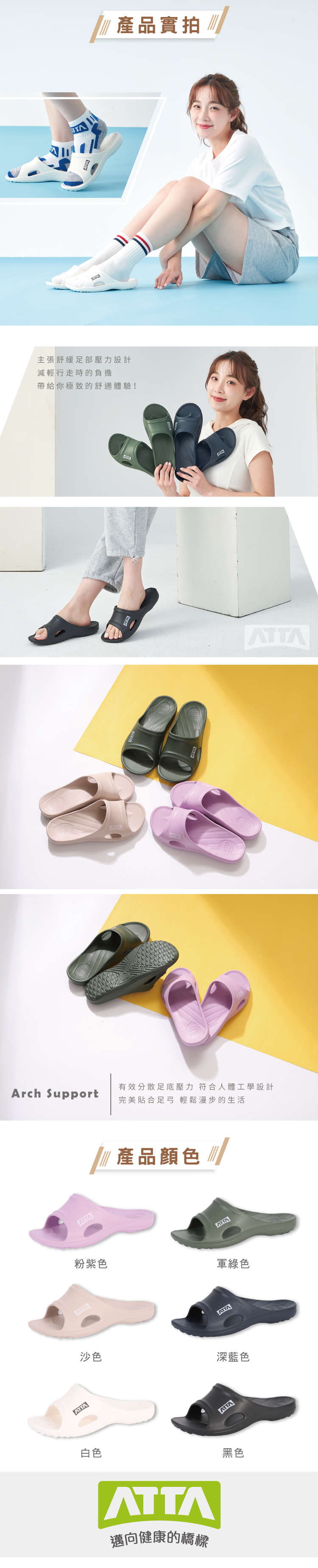 「ATTA」為專注於「足弓支撐」的拖鞋品牌,擁有獨創的 「 動態足弓設計 」 ,能夠自適應不同足弓形狀,不僅滿足舒適和支撐需求 ,更為常見足部問題如足底筋膜炎、扁平足帶來解決方案 。如同品牌標誌的象徵一樣 ,將持續以 「 足弓支撐解決方案 」 為核心 ,期望搭建人們 「 邁向健康的橋樑 」!