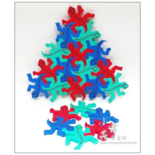這一隻隻以幾何六邊形為基礎,所設計而成的蜥蜴,是出自於荷蘭版畫藝術家M. C. Escher(莫里茨·科內利斯·艾雪)之手,每一隻蜥蜴的頭、腳、尾巴皆相同,不過只要轉換方向,卻是能讓一隻一隻的蜥蜴緊緊拼湊一起,並創造出有趣的變化或不同的幾何圖形。
