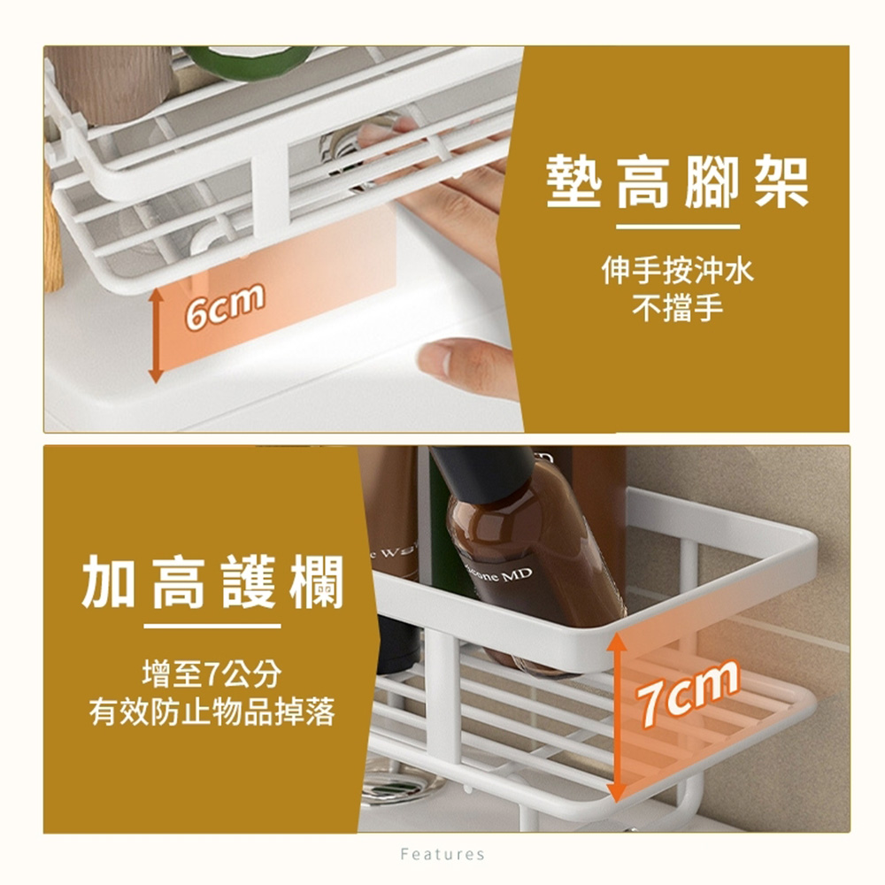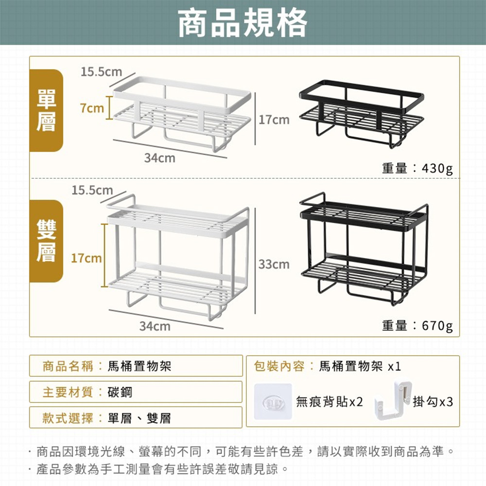 內容物:置物架x1、無痕卡扣背膠x2、掛勾x3