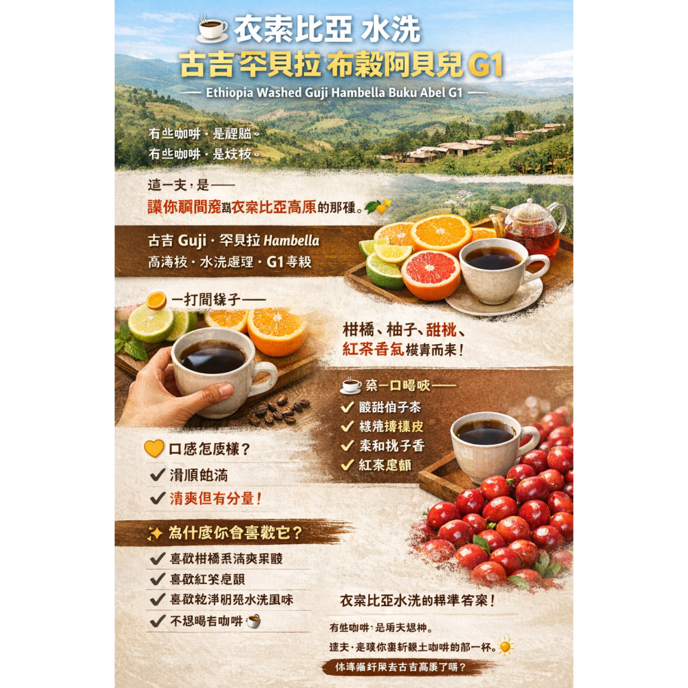 大家知道我對生活品質很挑剔吧?布穀阿貝兒(Buku Abel)這個產區在古吉本來就是傳奇等級。這款 G1 等級的水洗豆,它走的是一種「極致乾淨」且「層次豐富」的路線。