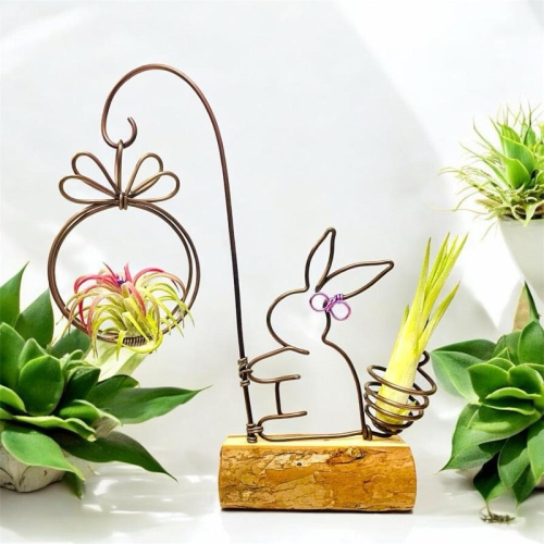微甜多肉小陽台.空氣鳳梨的家|鋁線手作.小兔兔與她的禮物.杉木底座(不含植物)