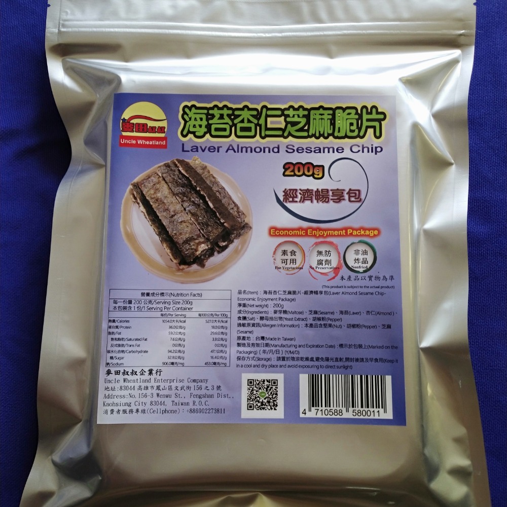 獨特天然海洋風味,嚴選優質海苔,搭配新鮮的杏仁與芝麻,口感香、鮮、酥、脆,片片完整豐厚,滿足您味蕾的需索。精選上等原料,低溫烘焙淬煉,鋪撒滿滿杏仁與芝麻,專業古法手工製成,保留最原始滋味。