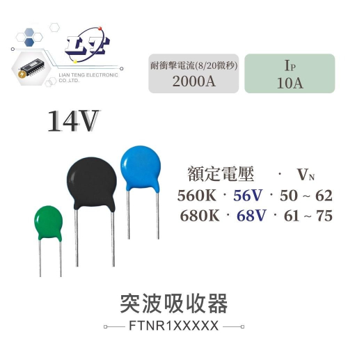 - 14V680K:額定電壓 68V,動作電壓範圍 61 ~ 75V