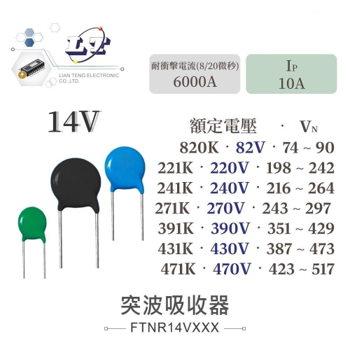 - 14V820K:額定電壓82V,動作電壓範圍74 ~ 90V