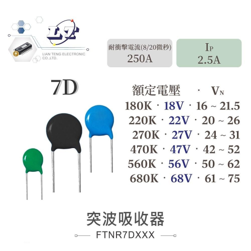 - 7D180K:額定電壓18V,動作電壓範圍16 ~ 21.5V