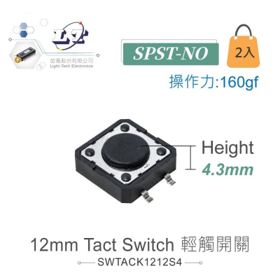聯騰.12mm Tact Switch 4Pin 輕觸 常開 12x12x4.3 SMD 12V/50mA 2入