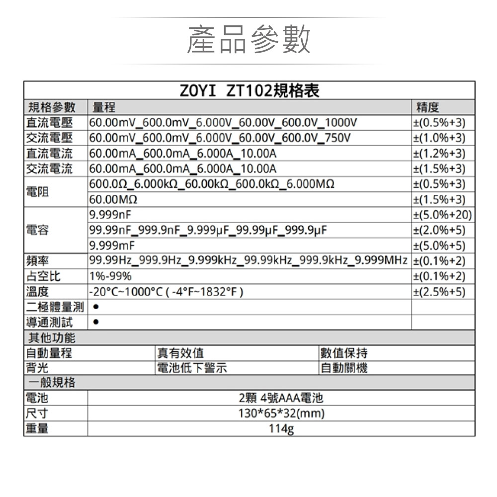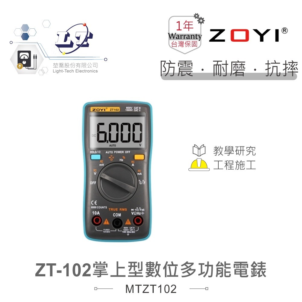 #ZOYI ZT-102#掌上型智能量測#多功能數位電錶#550V高壓保護#10A電流測量#自動量程#6000字高精度顯示#背光顯示#防折斷支架#數據保持#峰值保持#啟動電流測量#技術維修#電子測試#電工維修#高精度測試#NCV感應電壓測量#零/火線識別#一年保固#ZOYI眾儀電測