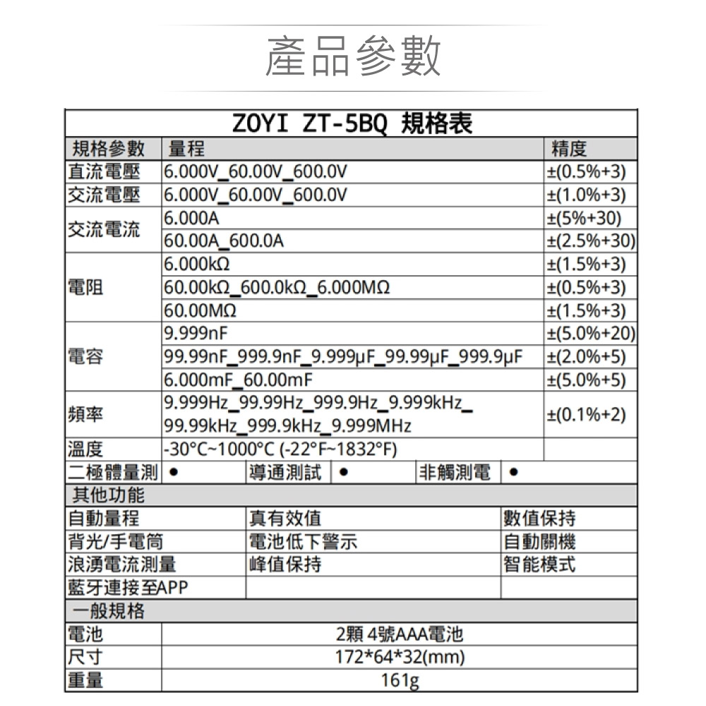 #ZT-5BQ#藍芽智能鉤錶#600A交流電流測量#電壓測試#電流測試#電阻測試#頻率測試#高精度測試#NCV感應電壓測量#數據保持#峰值保持#啟動電流測量#6000字真有效值#單手操作#手電筒照明#背光顯示#自動關機#零/火線識別#技術維修