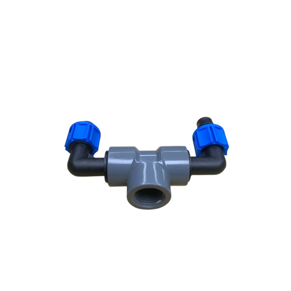 這個配件的核心價值在於 「雙帶連接+內牙銜接」,能讓滴灌系統在植床或大棚裡更高效佈管,減少安裝時間並提升灌溉均勻度。