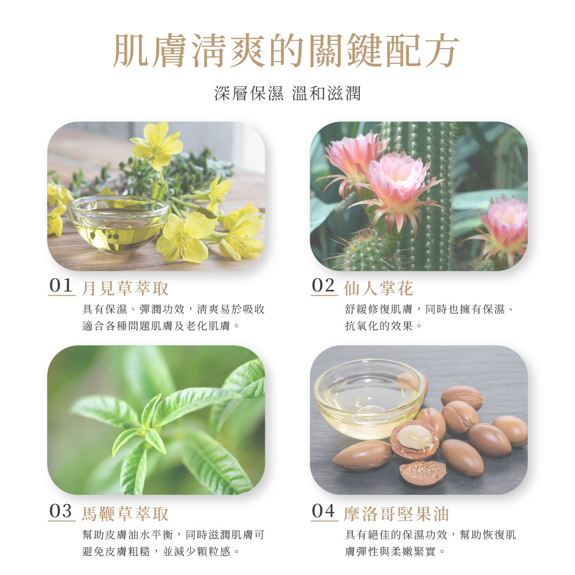成分:沙漠植物萃取 (月見草、馬鞭草、龍舌蘭、短葉絲菊、仙人掌花)