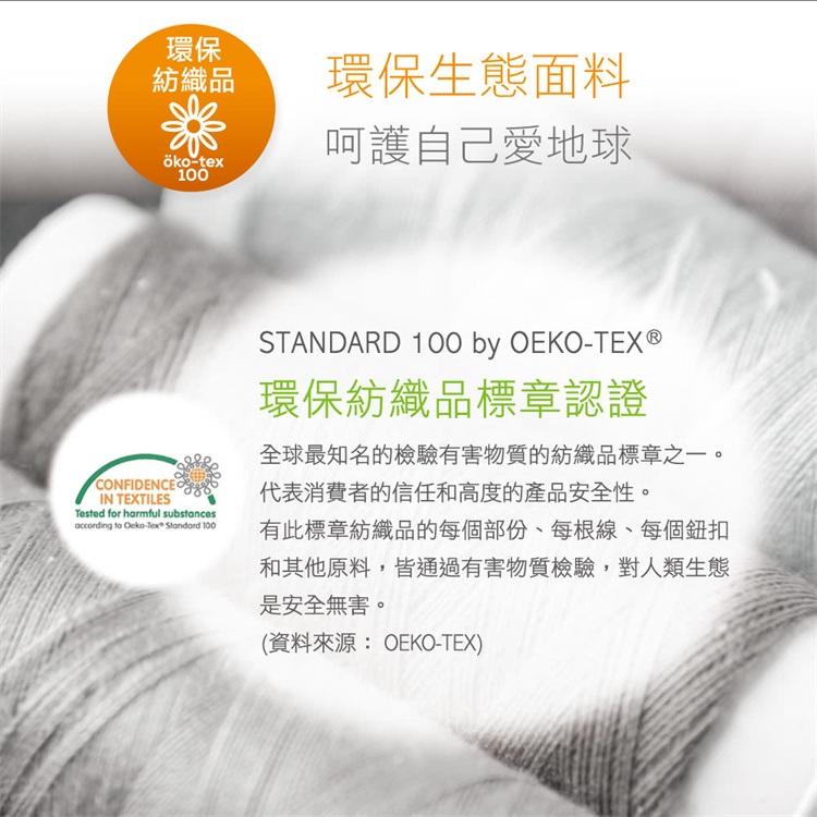 * 環保認證:獲得Oeko-Tex Standard 100 環保紡織品標章的認證