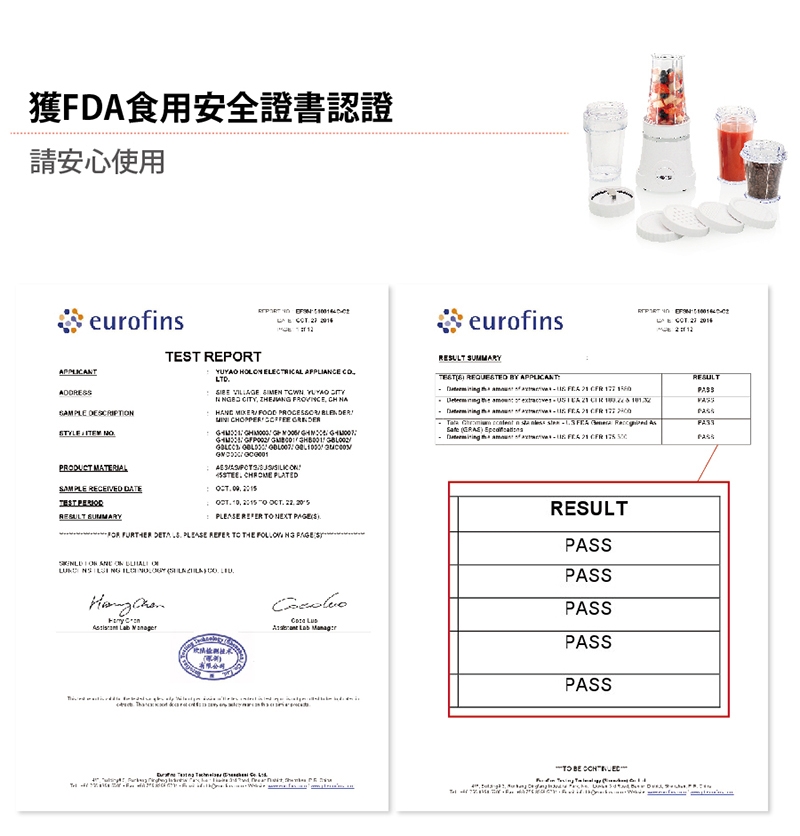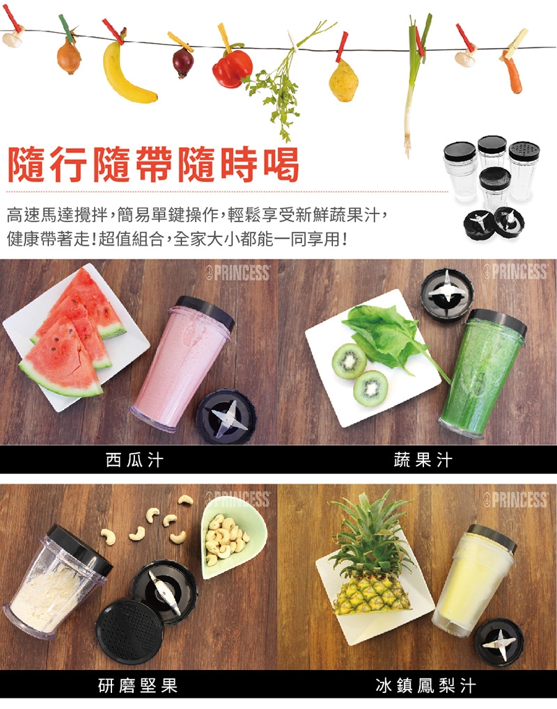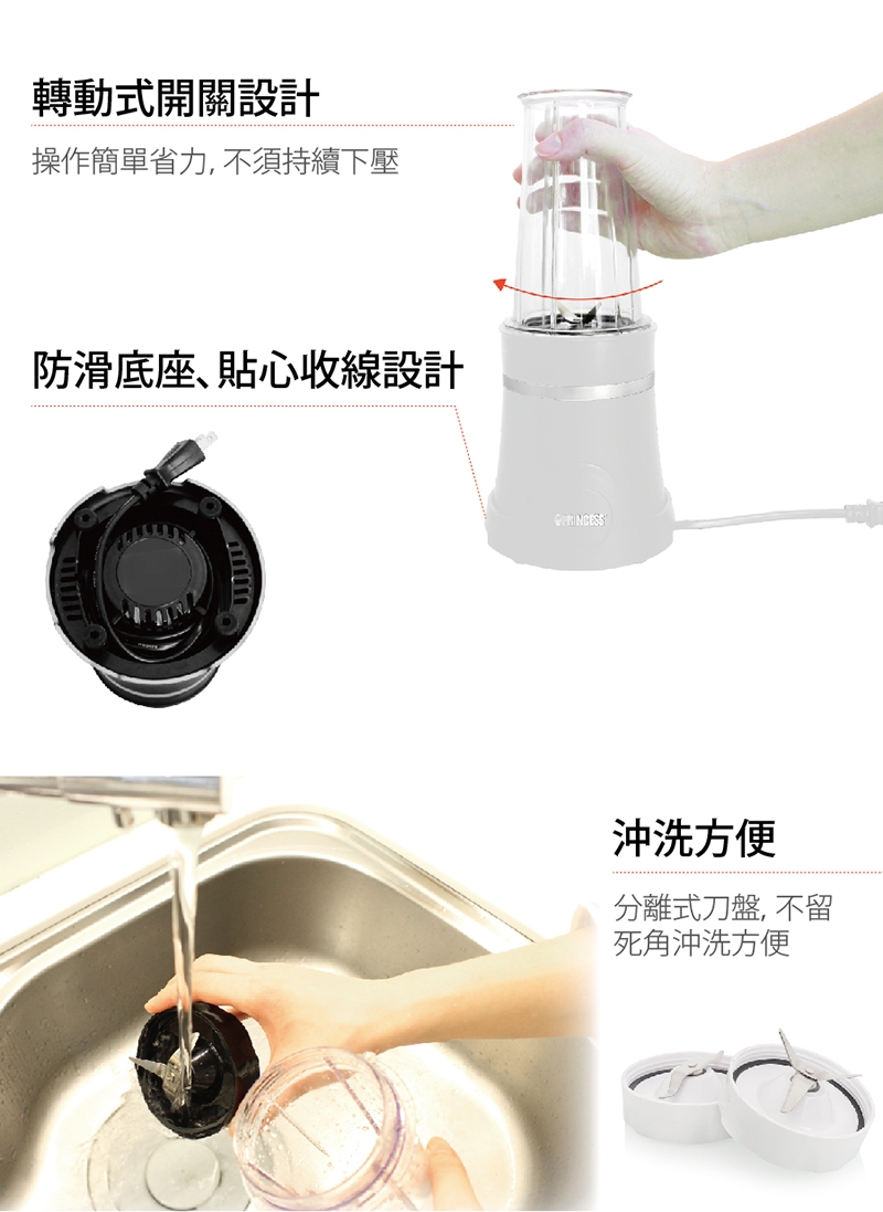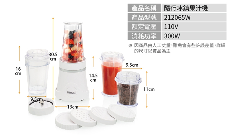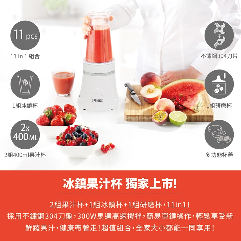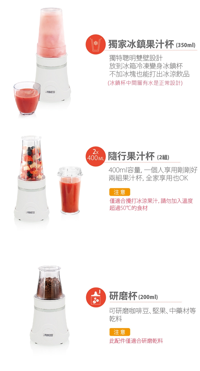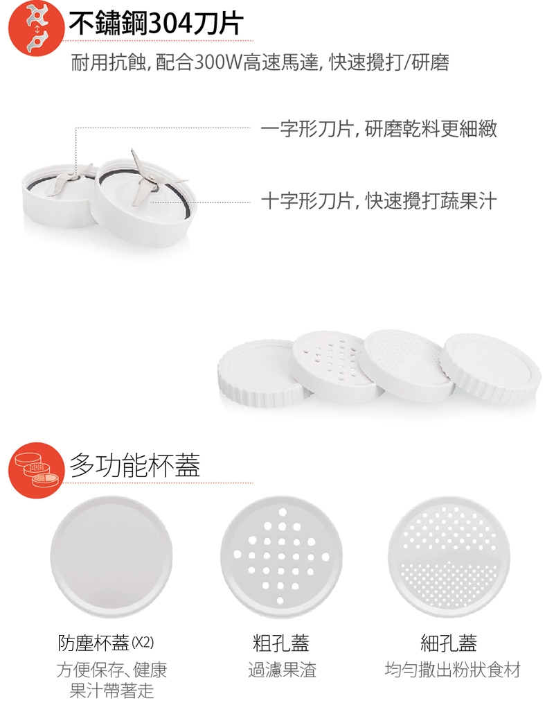 配件:主機、350ml冰鎮杯x1、400ml果汁杯x2、200ml研磨杯x1、杯蓋x2、粗孔蓋x1、細孔蓋x1、一字形刀片x1、十字形刀片x1、說明書(內含保卡)