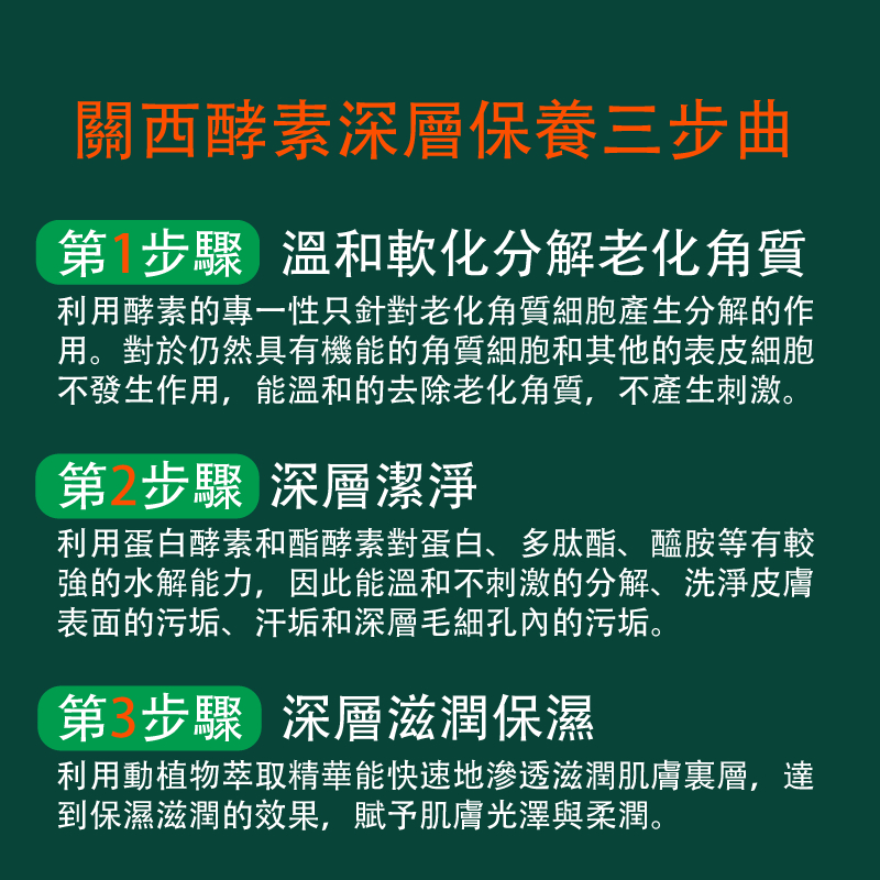 利用酵素分解的能力來溫和地軟化肌膚深層的污垢,免於用力搓揉就能輕鬆地洗淨肌膚,無負擔的去除污垢保持肌膚健康,肌膚洗淨後,再擦植萃酵素爽身粉,使肌膚表層多一層保護膜。