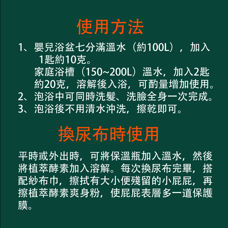1. 嬰兒浴盆七分滿溫水(約100L),加入1匙約10克;家庭浴槽(150~200L)溫水,加入2匙約20克,溶解後入浴,可酌量增加使用。