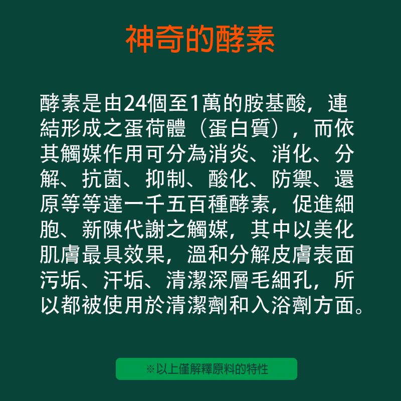 提取自高科技的酵素成分,尤其對嬰兒和成人、寵物角質代謝不良的肌膚類型具有很好的清潔力,尤其是敏感性皮膚的嬰兒和成人、寵物,純天然的酵素不會產生刺激,並説明肌膚恢復原本的彈性和光滑柔嫩的質感。