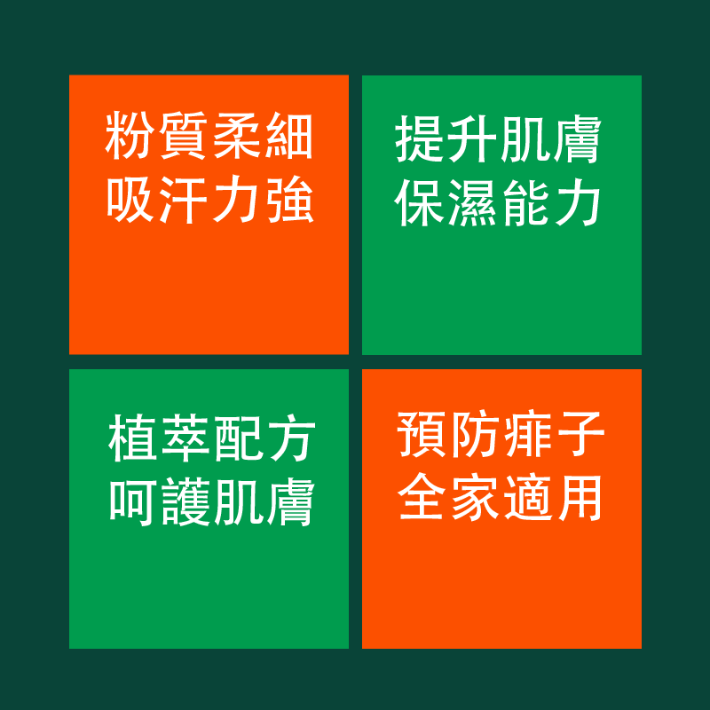 *粉質柔細,吸汗力強,避免被衣服磨擦,保持肌膚乾爽,使肌膚柔軟有彈性。
