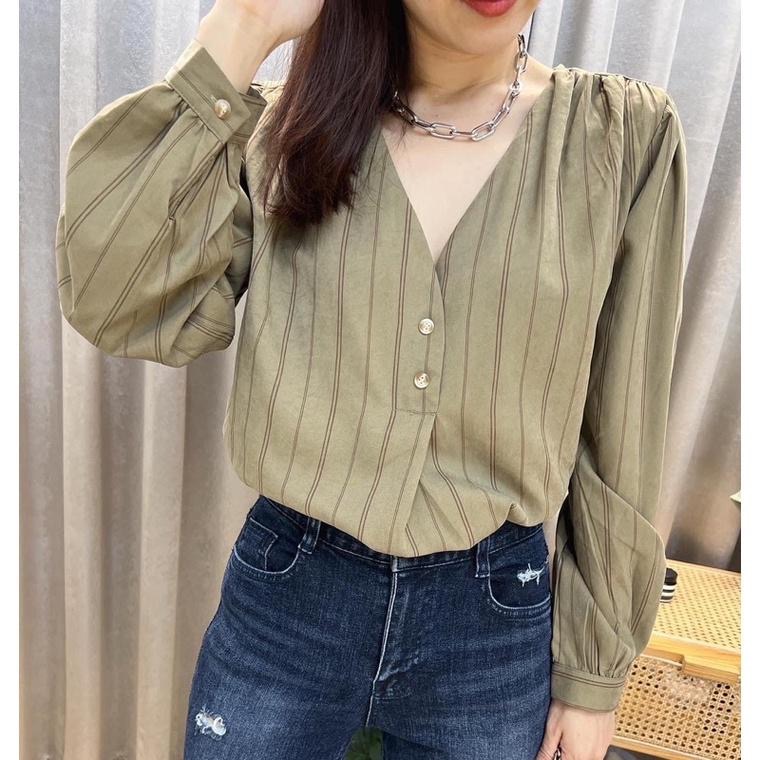 現貨♡ 5801 細緻絨 撞色 條紋 V領 女上衣 女長袖 秋款 氣質 淑女 女人味