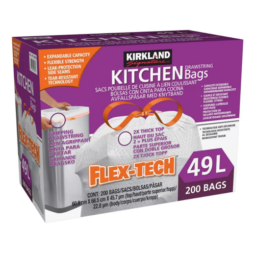 商品編號:#1628919 https://s-cf-tw.shopeesz.com/file/tw-11134208-81zto-mibqdukcizgje3 60.9公分 X 68.5公分/個 拉繩可束口設計 抽取式垃圾袋,韌度特強不易破裂 可填裝至少49公升的容量 平底式封口不漏水 適用於辦公室、餐廳、大型聚會、戶外露營、廚房或搬家等 商品規格: 品名 : Kirkland Signature 科克蘭 拉繩式垃圾袋 49公升 X 200入 內容量/入數 : 200入 商品重量 : 4.61公斤 商品尺寸 : 長 29公分 X 寬 15公分 X 高24 公分 成分 : 聚乙烯(PE) 使用方式 : 抽出即可使用 保存方式 : 請避免陽光直射,存放於乾燥陰涼處並遠離火源。 產地 : 美國 注意事項 : 1.請勿將垃圾袋套於頭上,以免窒息。 2.請將產品儲藏於孩童及寵物無法觸摸、攀爬取得或看見的安全位置。 3.不建議裝入食物。 品牌 : Kirkland Signature 科克蘭 商品容量 : 49公升