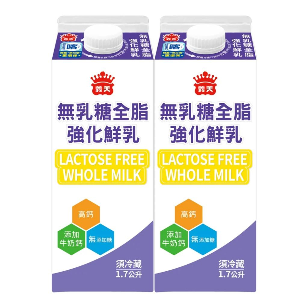 商品編號:#158292 00% 台灣生乳使用製作 使用乳糖酵素分解乳糖 添加牛奶鈣 有助於維持骨骼與牙齒的正常發育及健康 https://s-cf-tw.shopeesz.com/file/tw-11134208-81ztd-mjwo8ovy4kqpfc 商品規格: 品名 : 義美 冷藏無乳糖全脂強化鮮乳 1.7公升 X 2入 內容量/入數 : 1.7公升 X 2入 成分 : 生乳、牛奶鈣、乳糖酵素 (符合國家標準 CNS3055之生乳規定) 保存方式 : 冷藏 7°C 以下,開封後請於3天內飲用完畢。 保存期限 : 以消費者收受日起算,至少距有效日期前2日以上 產地 : 台灣 食品業登錄字號 : A-111768704-00000-2 產品責任險契約字號 : 0800第13PDT00094號 過敏原資訊 : 本產品含有過敏原:奶類成分。本產品與其它含有花生、含麩質的穀物、堅果類、芝麻、大豆類、蛋類的產品於同一工廠生產,食物過敏者請留意。 製造/委製/進口商名稱 : 義美食品股份有限公司 製造/委製/進口商電話 : 0800-255-999 製造/委製/進口商地址 : 台北市信義路二段88號10樓 品牌 : I-MEI 義美