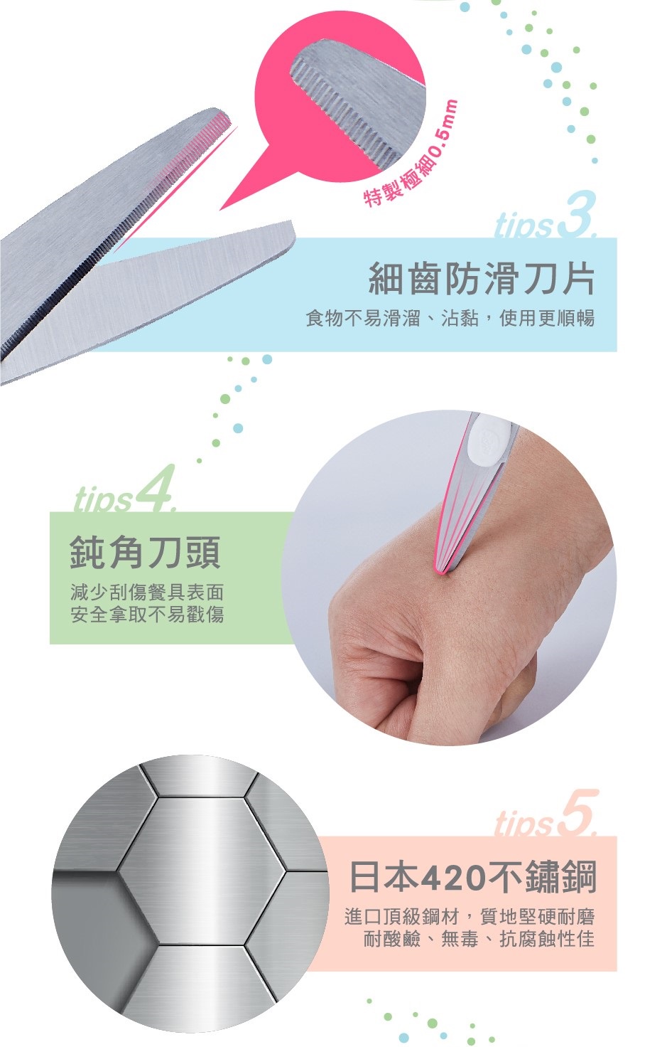 3、細齒防滑刀片:特製極細0.5mm齒狀刀片,食物不易滑溜、沾黏,使用更順暢。