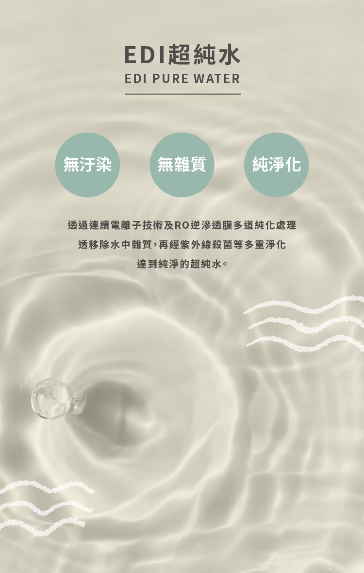 ◎採用EDI超純水,清爽潔膚無負擔,水質經逆滲透模純化處理、紫外線殺菌及多重濾淨系統,去除水中雜質,超高純淨度。