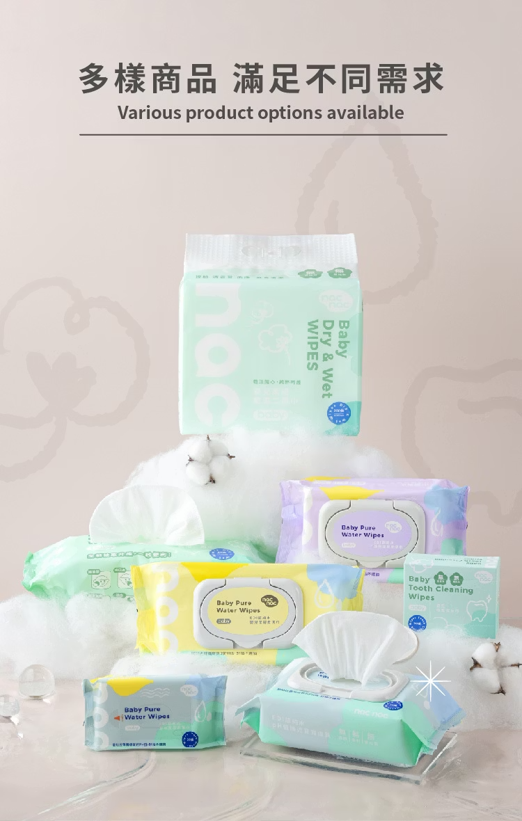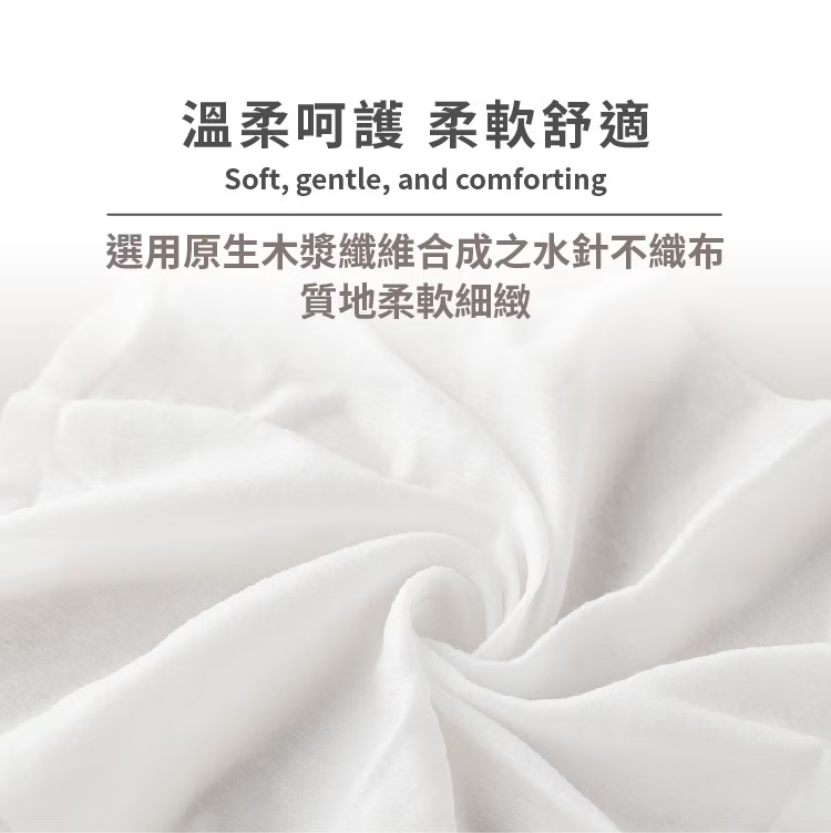 ◎原生木漿纖維合成之水針不織布,高飽水量,柔軟親膚。