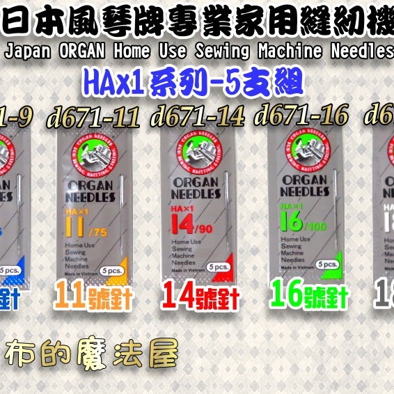 日本知名品牌ORGAN NEEDLES風琴牌家庭用縫紉機車針HAx1系列,為特殊針頭設計,針頭處一邊半圓一邊是平面.正常使用不易斷裂,尺寸規格精準,對應各種布料厚度,共有9/65, 11/75, 14/90, 16/100, 18/110等5種車針型號,數字愈大代表車針愈粗.