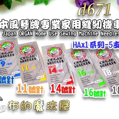 日本知名品牌ORGAN NEEDLES風琴牌家庭用縫紉機車針HAx1系列,為特殊針頭設計,針頭處一邊半圓一邊是平面.正常使用不易斷裂,尺寸規格精準,對應各種布料厚度,共有9/65, 11/75, 14/90, 16/100, 18/110等5種車針型號,數字愈大代表車針愈粗.
