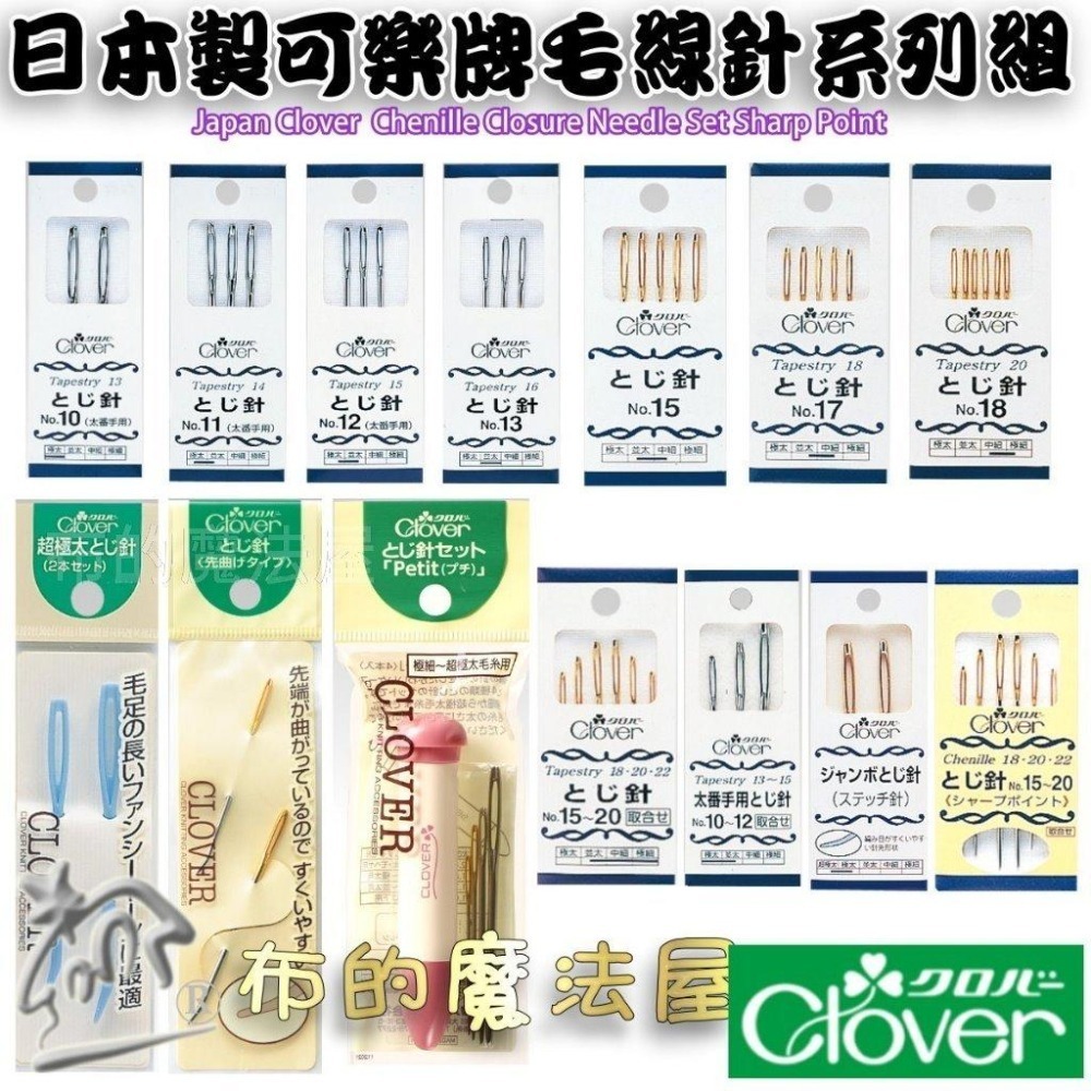 ● ╭*產品簡介。 1組價。 可樂牌10~20號各類粗細毛線用針。 產地:日本 品牌:可樂牌 規格: 10~20號各類粗細毛線用針。 材質:鋼 ☆ 本款日本製可樂牌毛線針組 Japan Clover  Chenille Closure Needle Set Round Point ,針尖是圓的,線不會斷。圓頭毛線縫針,不勾線,用於編織結尾藏線、毛線刺繡及肩線、協邊、袖子接合 組合式縫針,可依照毛線粗細選擇適合縫針縫製-選擇與紗線相符的針會對成品產生影響。 用於針織和紗線刺繡的整理。非常方便,適合粗毛線用針眼孔大的縫針,另有縫合針No.15-20<尖頭>透過分線縫製時非常方便。圓頭毛線縫針,不勾線用於編織結尾藏線、毛線刺繡及肩線、協邊、袖子接合 組合式縫針, 可依照毛線粗細選擇適合縫針縫製 -  布的魔法屋。 d215-1: No.10 極太(粗線用)  針粗 2.40mm  長度 70.0mm d215-2: No.11 極太(粗線用)  針粗 2.10mm  長度 65.0mm d215-3:  No.12 圓針頭極並太(粗線用)  針粗 1.81mm  長度 60.0mm d215-4:  No.13 並太(中粗線用)  針粗 1.6mm  長度 57.6mm d215-5:  No.15 並太/中細(一般毛線用)  針粗 1.35mm 長度 54.6mm d215-6:  No.17 並太/中細(一般線用)  針粗 1.24mm  長度 48.5mm d215-7:   No.18 中細/特細(中細線用)  針粗 1.07mm  長度 45.5mm d215-8:   No.15-20  針頭為尖頭 六入針組 一般至極細毛線用  (黃色袋) 15 號 針粗  1.35 mm,長度 54.6 mm  2 支入 17 號 針粗  1.24 mm,長度 48.5 mm  1 支入 18 號 針粗  1.07 mm,長度 45.5 mm  2 支入 20 號 針粗  0.89 mm,長度 40.0 mm  1 支入 d215-9:   No.15-20  針頭為圓頭 六入針組 一般至極細毛線用   (白色袋) 15 號 針粗  1.35 mm,長度 54.6 mm  2 支入 17 號 針粗  1.24 mm,長度 48.5 mm  1 支入 18 號 針粗  1.07 mm,長度 45.5 mm  2 支入 20 號 針粗  0.89 mm,長度 40.0 mm  1 支入 d215-10:   No.10-12  針頭為圓頭 三入針組 極太/並太 粗線毛線用   10 號 針粗  針粗 2.40mm  長度 70.0mm  1 支入 11 號 針粗  針粗 2.10mm  長度 65.0mm  1 支入 12 號 針粗  針粗 1.81mm  長度 60.0mm  1支入 d215-11:   可樂牌掛袋包裝 No.10-12  H型粗縫針組     (綠標掛袋)                   針頭為圓頭 三入針組 極太/並太 粗線毛線用   10 號 針粗  針粗 2.40mm  長度 70.0mm  1 支入 11 號 針粗  針粗 2.10mm  長度 65.0mm  1 支入 12 號 針粗  針粗 1.81mm  長度 60.0mm  1支入 d215-12:   可樂牌掛袋包裝 No.15-20  H型細縫針    (綠標掛袋)            針頭為圓頭 六入針組 極細至極太毛線用   15 號 針粗  1.35 mm,長度 54.6 mm  2 支入 17 號 針粗  1.24 mm,長度 48.5 mm  1 支入 18 號 針粗  1.07 mm,長度 45.5 mm  2 支入 20 號 針粗  0.89 mm,長度 40.0 mm  1 支入 ☆ 賣場還有毛線針.編織針系列 ☆  賣場還有特殊針.疏縫 .彎針.盲針.皮革針.帆布針系列  ☆ 如圖: 賣場還有各類日本進口手縫針.壓線針.拼布縫針,刺繡針,綜合針,黑金剛手縫針,日本風琴牌車針,盲針,珠針待針, 特殊彎針....等多樣化的款式任您選擇! ☆  賣場所有針.手縫針.車針.針盒系列