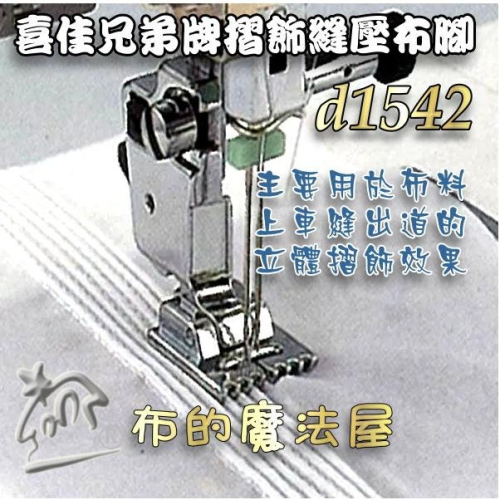 ● ╭*產品簡介。 報價為1組價。 台灣製造喜佳Brother 7mm摺飾縫壓布腳。 產        地:台灣 品        牌:喜佳 適用機型:適用機型:A、B、C、D、E、F、G、H、I、J、L、O、所有brother機型家庭用桌上型適用。 尺       寸 : 以實際商品為準。 產品特色: ☆ 本款台灣製造喜佳Brother 7mm摺飾縫壓布腳 主要是用於在布料上車縫出1道道的立體摺飾效果。壓布腳底布有7到槽,換裝雙針,調整先張力,縫紉時利用雙針的間距配合溝槽的引導,即可輕鬆車縫初一道一道的褶飾 - 布的魔法屋。
