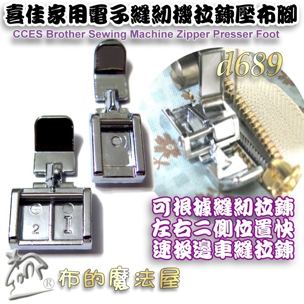 本款喜佳7mm縫紉機拉鍊壓布腳(CCES brother Zipper presserfoot),適用於家庭用縫紉機。壓布腳共有左右兩個扣合的邊,可根據縫紉拉鍊右側或左側位置來快速換邊車縫。換裝本壓布腳僅能選用直線中針位花樣-布的魔法屋。